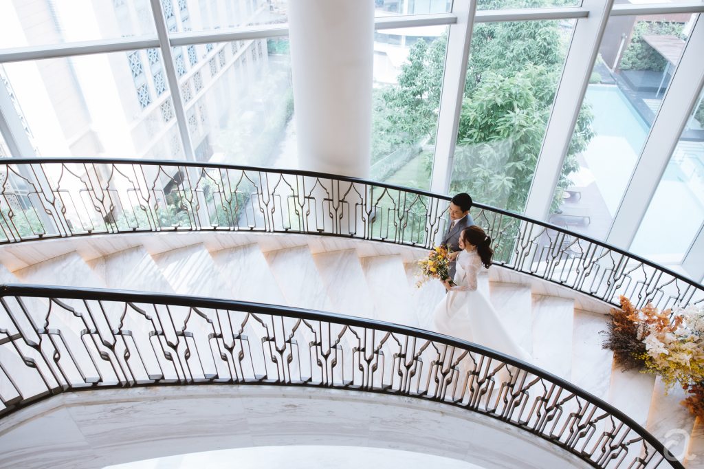 Waldorf Astoria Bangkok อีกหนึ่งโรงแรมหรู่ที่คู่รักหลายๆคู่ เลือกให้เป็นสถานที่จัดแต่งงาน จุดเด่นของ Waldorf Astoria Bangkok น่าจะเป็นโถงบันไดวน ที่ได้แสงธรรมชาติ